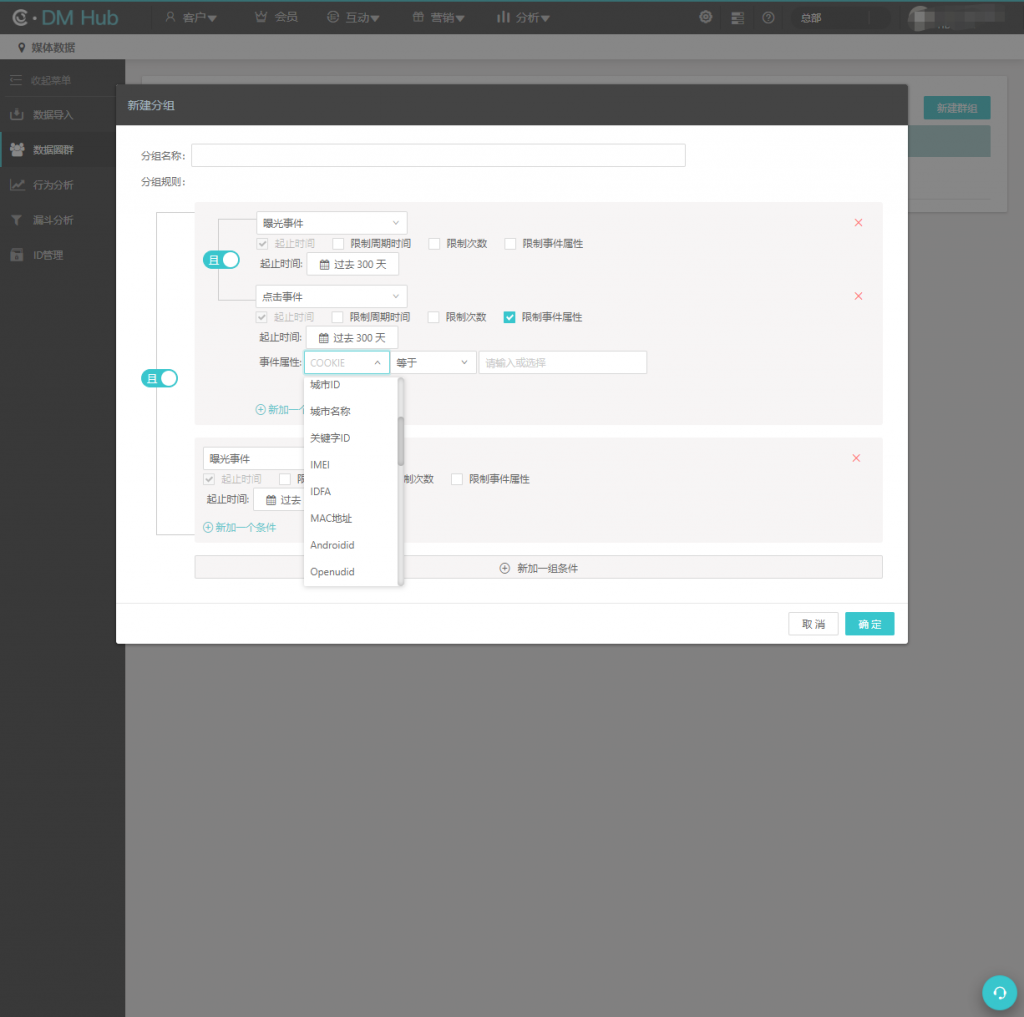 在“媒体数据”子模块中,在你正确导入了数据之后,你可以根据客户的媒体数据对客户群体进行分组,与“群组”子模块的分群方式一样,只是其中的数据字段(属性)都是媒体相关,如下图所示。