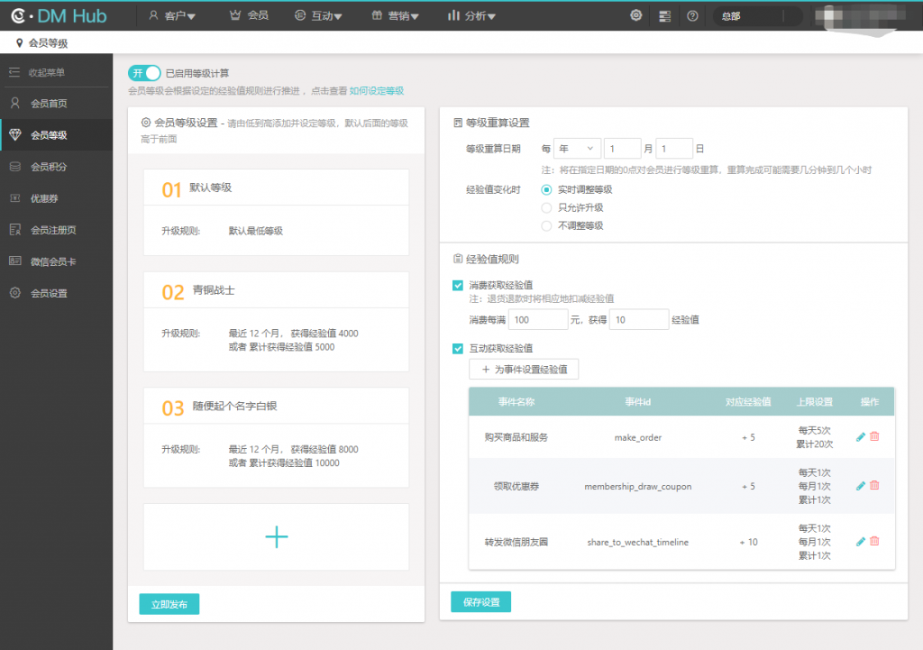 DM Hub的会员等级的定义支持按照消费金额来划分,也支持按照会员的行为来划分。如下图所示。