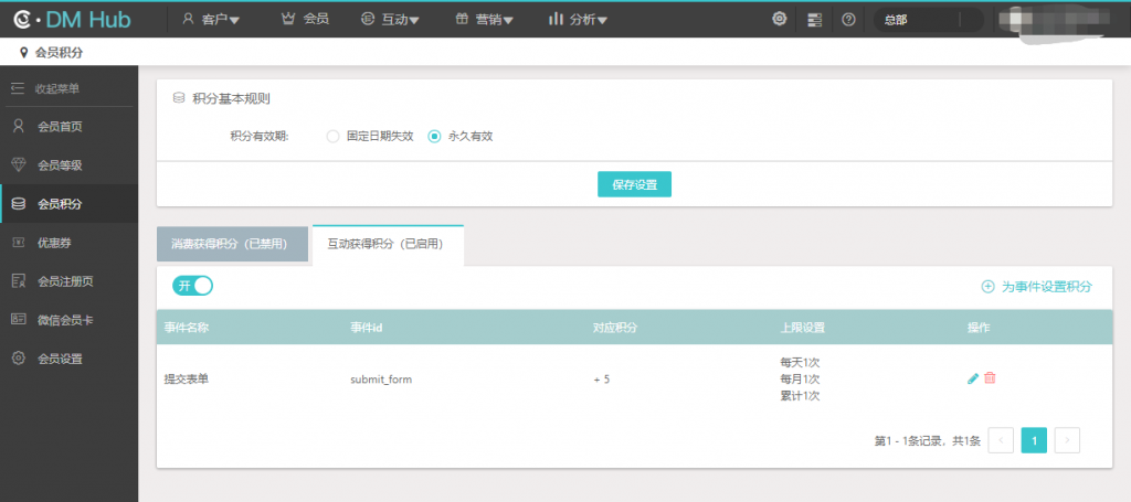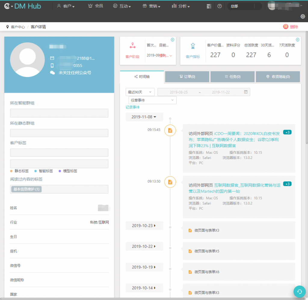 你会发现这个界面中不仅仅展示了他的基本信息(左侧),更展示了他的行为(右侧)。在数字营销中,消费者的行为包含了更多的信息,例如,行为直接反映了他的兴趣与需求,并反过来为我们的营销策略提供依据。在DM Hub中,所有有关筛选人群、自动化的营销策略与执行的触发、会员的管理等等,都需要消费者的行为数据提供支撑。