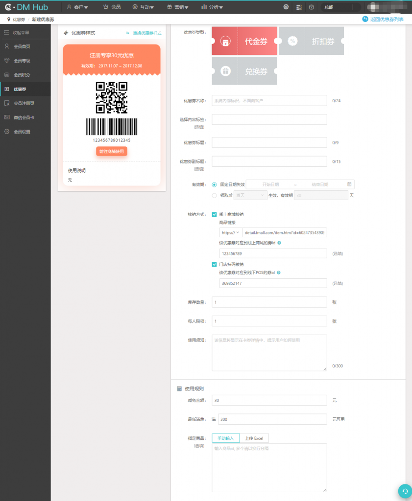 “优惠券”子模块的功能是帮助企业快速生成一个HTML5(后简称H5)的优惠券。这个优惠券可以是线上优惠券,也可以是线下优惠券。优惠券可以直接对接到企业的电商平台。但请注意,如果这个优惠券不是全局性的(全场通用的),而是针对不同个人进行核销的,那么无论是线上还是线下的优惠券,都要确保该优惠券的ID,与实际销售系统内可以核销的优惠券的ID一致。
