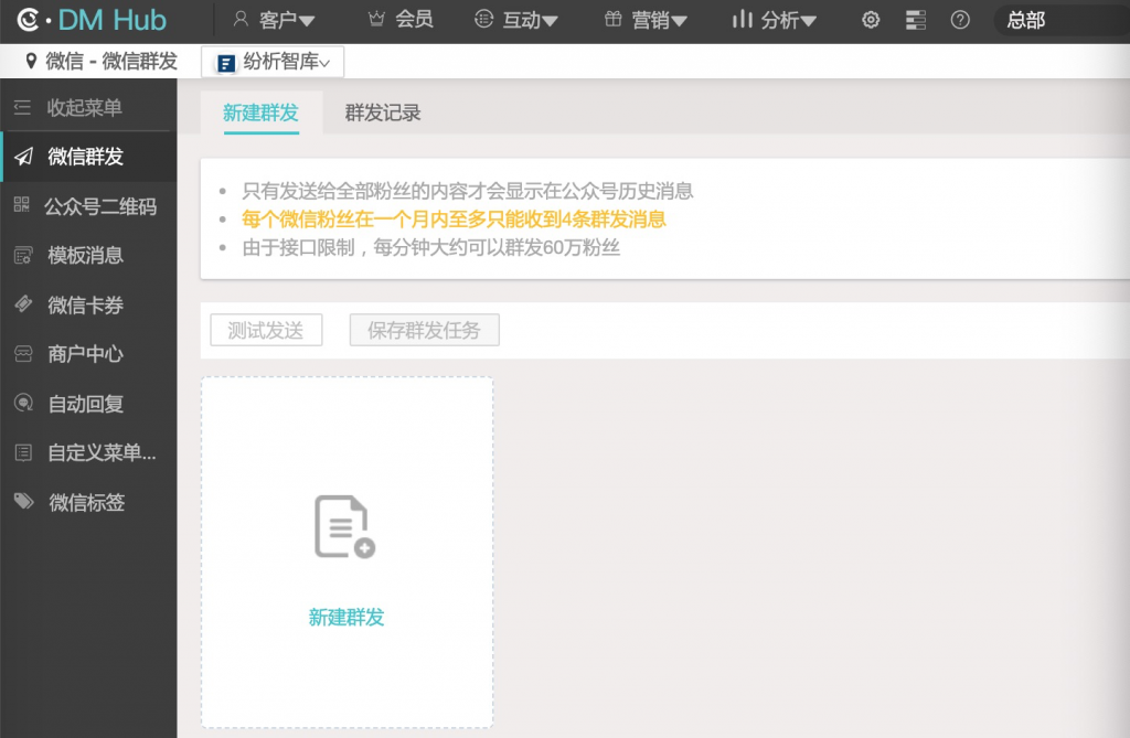 互动模块对触点的内容素材进行创制,并对触点内的互动进行管理,实际上已经可以完成单触点上的营销。但,我们也知道,更多时候,一次营销有很多触点的共同参与。例如,你显然不会只发一个短信,然后守株待兔地等着消费者叩响你的门,你一定还会制作H5落地页(DM Hub所称的微页面),甚至还要在微信公众号中跟目标人群进行群发,从而形成立体化、网络化的营销覆盖。