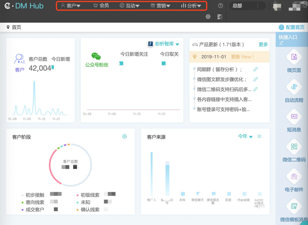 - 几乎支持企业所有的营销触点,如微信、小程序、网站、App、邮件、短信等, 与微信公众号的整合能力尤为出色。