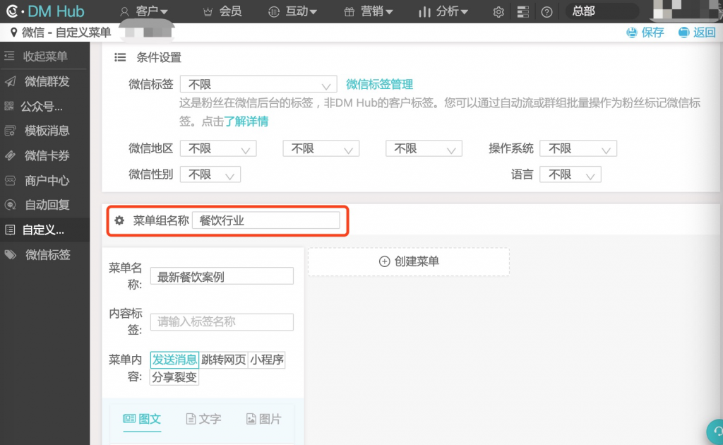 另一个常见应用,自定义菜单,也可以通过DM Hub的互动模块进行管理。针对不同人群,设计不同菜单栏,这部分非常适用于需求明确的B2B行业。例如,一家财务软件公司,有餐饮、家具、服装几个行业的解决方案,我们可以让餐饮行业用户,在微信菜单里看到餐饮行业解决方案、最新案例和产品demo,以此类推,实现个性化沟通。