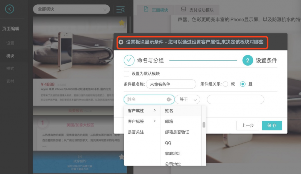 在DM Hub中,企业可以定义微页面具体形式内容,以及微页面会展示给什么样的人群(这些人群,实际上是在A客户模块中进行预定的)。