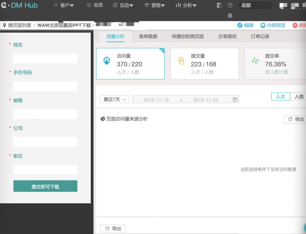 除了企业微信服务号的内容和互动的管理,DM Hub也支持创制和管理企业的H5页面,即“微页面”子模块。