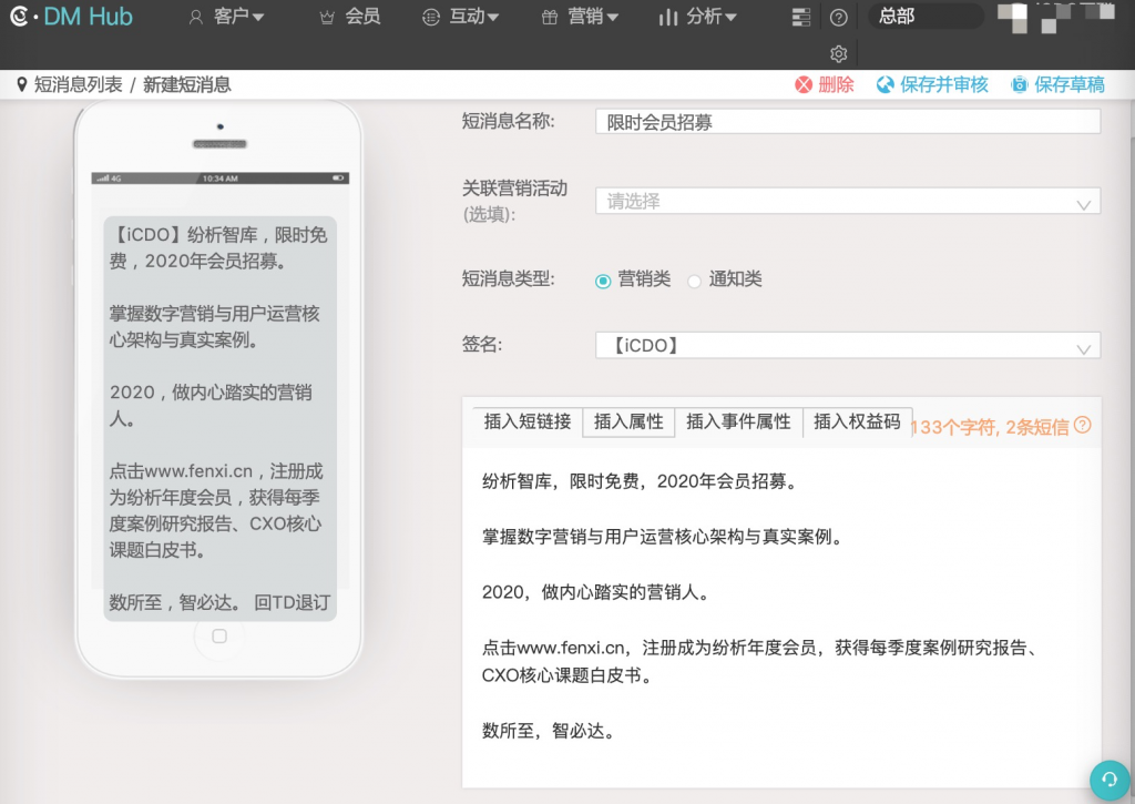 余下诸如小程序、短信、邮件、app推送等细分模块,与微信公众号、微页面等子模块没有本质差别,只是具体功能实现和内容模板不尽相同,不再过多赘述。比如,以品牌零售常见的短信营销为例。