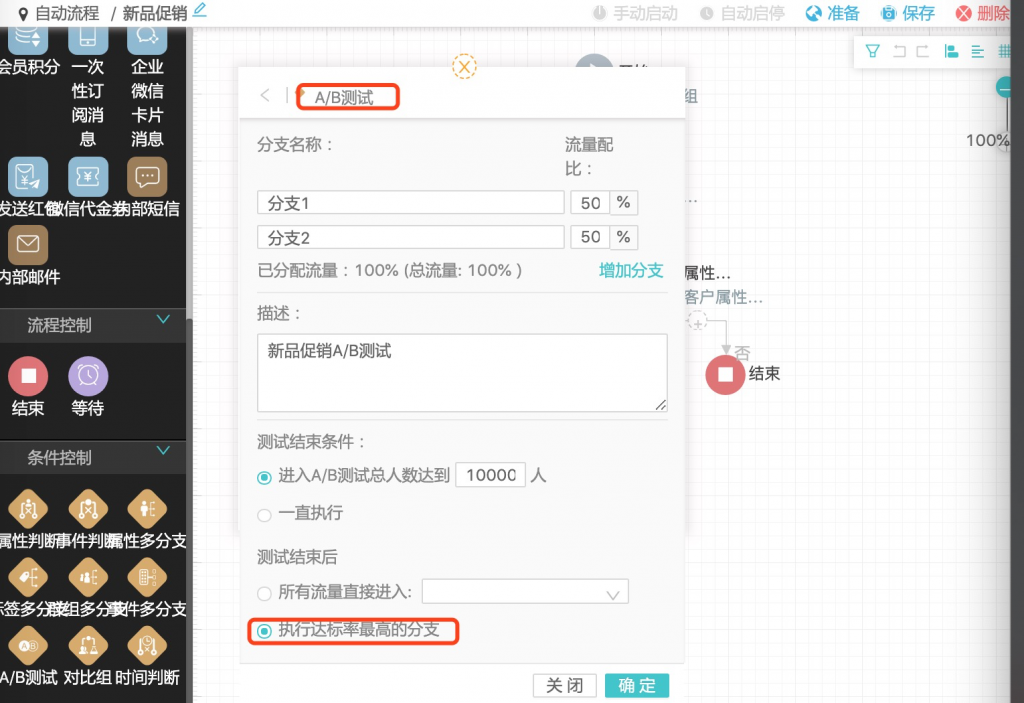 这个模块的最后,我们再看一个重要功能,A/B测试。DM Hub支持在自动流程里直接进行A/B测试。典型的应用场景,新品推广,首先选择10000人进行A/B测试,为两版本图文素材分别分配50% 的流量,测试结束后其他的流量自动执行达标率最高一组素材。