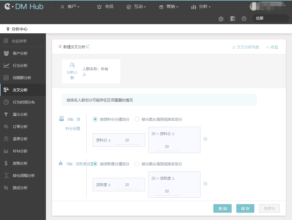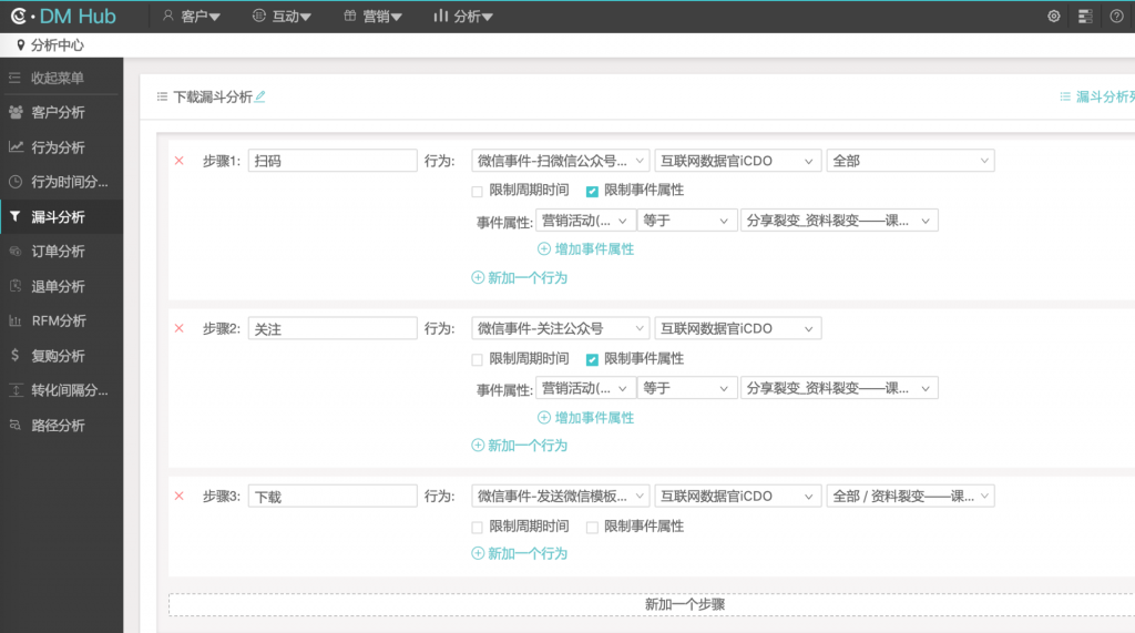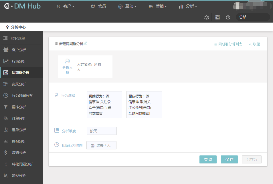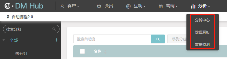 DM Hub的分析模块一共有三个子模块,分析中心、数据看板和数据监测。