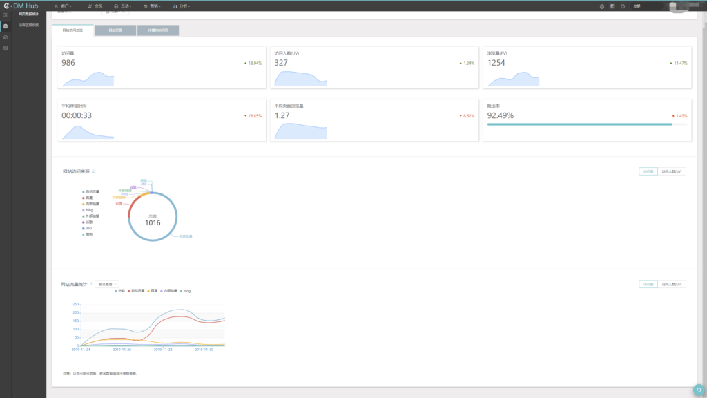 第三个子模块——数据监测,是对企业的数字触点的流量和情况进行监测的模块。支持网站、小程序和H5页面的流量监测。下图以网站的流量监测为例:
