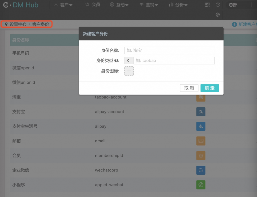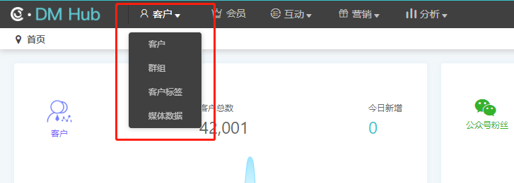 DM Hub的客户模块主要包含客户、群组、客户标签、媒体数据等子模块。