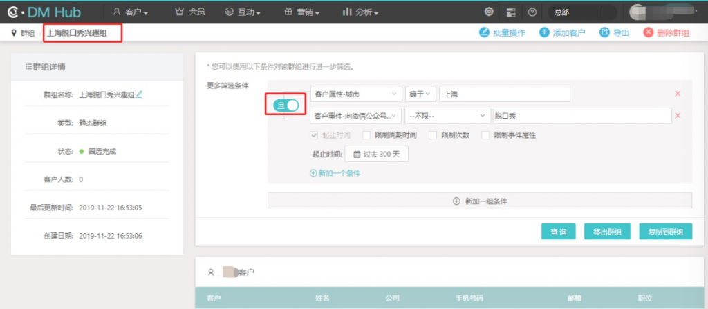 以一个常见的场景为例,某培训机构粉丝近百万,近期将在上海开设脱口秀表演线下培训课,准备对上海的目标人群做一轮推广。为实现这一目的,在DM Hub中,新建群组-上海线下课兴趣;然后,设置对应的人群条件,比如,客户属性-城市-上海;再加上客户事件-微信回复-向微信公众号回复-脱口秀,满足条件的人群自动进入该群组;之后,即可对该群组的人进行针对性的营销(在我们后面将要讲到的“D.营销模块”中实现)。