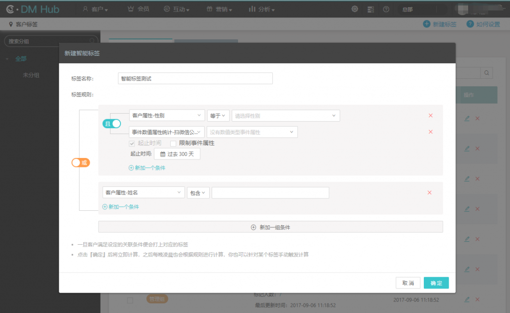 第二种标签,是“智能标签”。智能标签是极为常用的标签,是企业根据客户的属性和行为数据按照自定规则创造的标签。在其他工具中,类似的标签类型也可能被称为“动态标签”,本质上都是一样的。例如在下图中,符合下面规则的客户,都会被自动打上“智能标签测试”的标签。