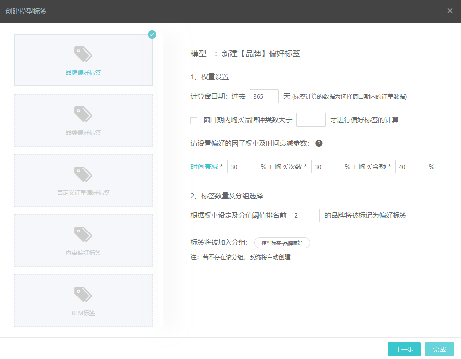 模型标签支持一些常用的预制的模型,比如判断客户的品牌偏好的模型。这一类标签的丰富程度取决于支持模型的数量。DM Hub支持常用的一些客户建模方式,除了上面的品牌偏好的建模,还有包括订单、内容及行为(如RFM模型)等建模方式,涵盖了大部分的应用场景。