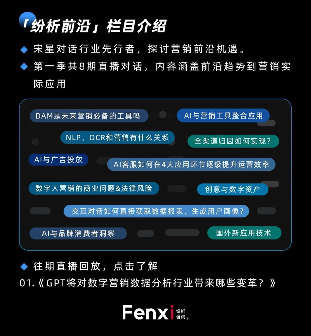 上期直播《GPT将对数字营销数据分析行业带来哪些变革?》(点击了解),本期直播详情及报名方式参见下方海报。