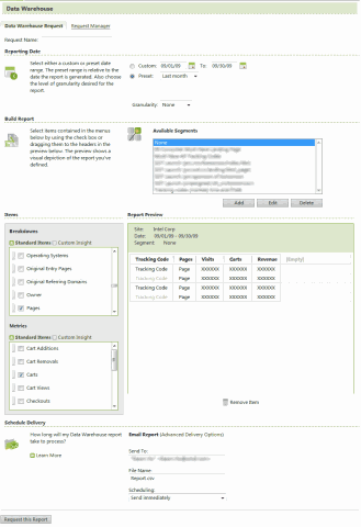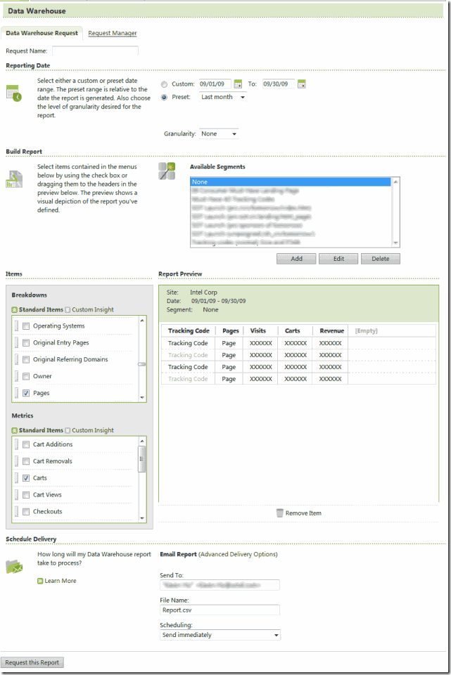 极为强大的定制化是Omniture最重要的杀手锏,除了度量,我们也可以在Data Warehouse中定义我们需要的更灵活的数据组合,如下图所示: