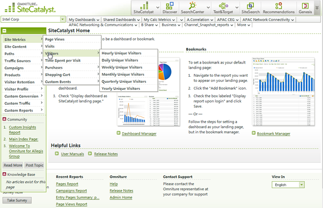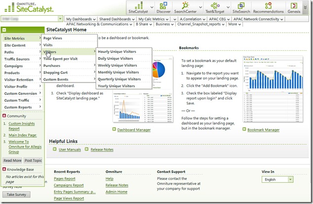 Omniture的产品如此之多,但核心是SiteCatalyst。SiteCatalyst(现在版本是14.6)的界面和GA有类似之处,如下图: