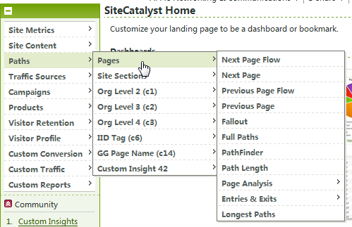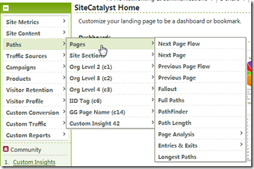 同GA类似,Dashboard(精要简报)在中间,是可以自定义的,而菜单在左侧,包含我们最基本和最主要的那些度量:流量的、内容的、Traffic Source(流量源)的还有Visitor(访问者)的度量等。不过,与GA不同的是,我们能在Omniture中看到一些不同的功能,例如Paths。