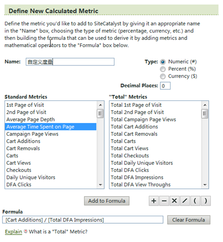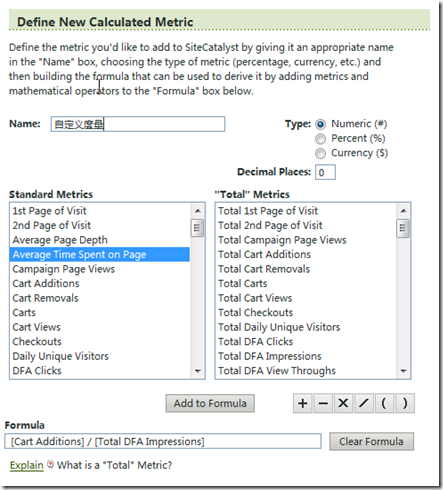 与GA的度量不能定制不同,SiteCatalyst提供可以定制化的度量——这是另一个Omniture要比GA更加强大的地方所在。如下图所示,我们可以按照多种度量组合来建立新的所需度量。值得一提的是,Bounce Rate在Omniture中并不是基本度量,我们需要用Single Access/Entrances来自行定制这个度量。是不是很有意思?