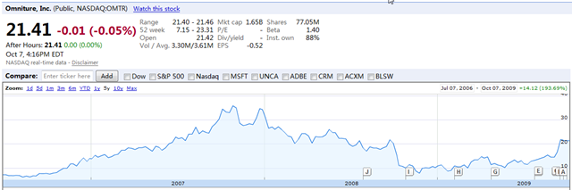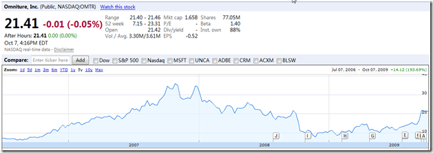 图:Omniture的Nasdaq曲线(全部时间),2007年和2008年是黄金期,而近期的收购消息又令其股价上涨。但是,有意思的是,似乎股价从来没有超过新浪、网易和搜狐