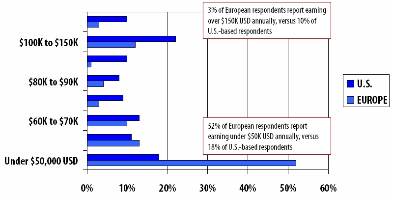 从网站分析师的收入(税前收入)上看,美国的收入相对较高,2007年大概一个中级的网站分析师能够有年薪10万美元左右的收入,而初级分析师在5万到6万左右;而欧洲则略低,2007年,中级分析师的年收入约为6、7万美元,而初级分析师大概年薪在4到5万美元。当然,无论是在美国还是在欧洲,资深分析师的收入是上不封顶的,超过20万美元也是正常现象。2009年的经济危机发生后,网站分析师的收入可能受到影响,但总体影响不大,2010年薪资水平会期待有所提升。