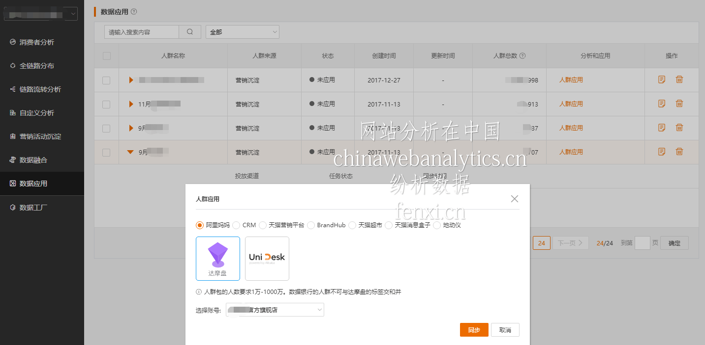 然后,你选定的人群分类(也被称为特征人群,因为是你选出来的,具有某些共性特征的人群),可以转移给“数据应用”,然后在这里选择可以使用这些数据进行投放的广告资源,也可以放到数据工厂内做进一步的加工,实现更大范围的人群扩展。