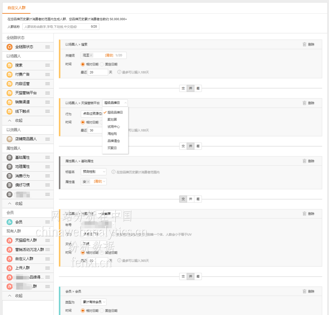但是,在人群定向投放上,阿里的数据银行还是可以起到很多作用。首先,数据银行提供了支持非常多条件的人群选择规则,从而可以以很细致的维度选择不同的人群。