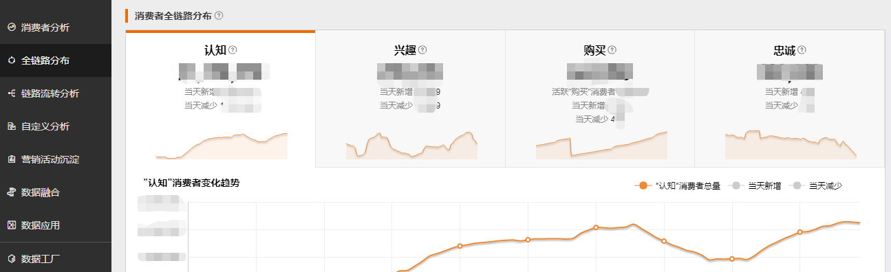 从上面的截图,你可以看到,阿里数据银行不仅仅提供了常见的广告投放的基础指标“认知”,还有另外三类指标:“兴趣”、“购买”和“忠诚”。