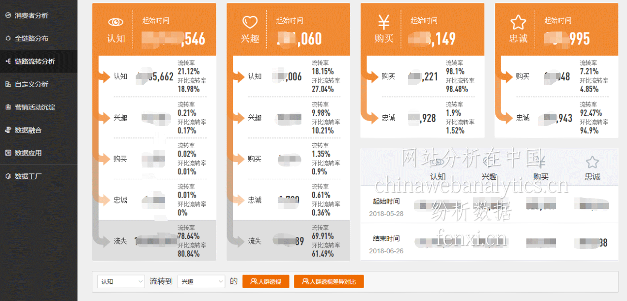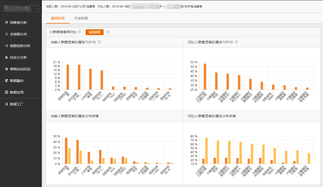 而且不同分类的人群,比如在认知-兴趣-购买-忠诚中处于不同的阶段的人群的相互对比,或者作出了不同行为的人群的相互的对比。