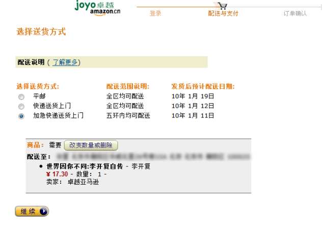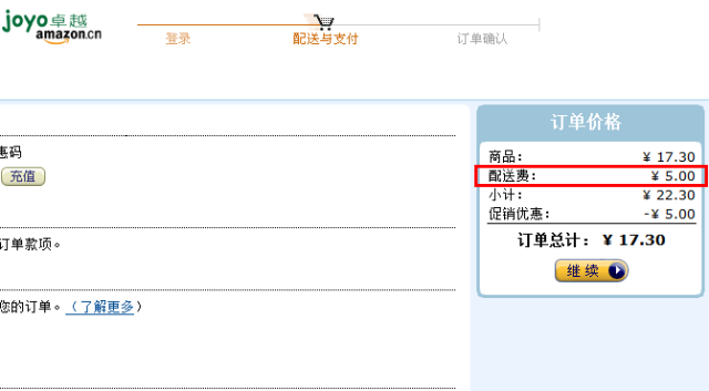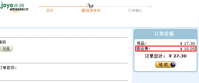 Joyo提供了三种送货方式,可是三种方式均没有标明配送价格,因此,有点儿摸不着头脑,只能先随便试试。一般而言,你会选择试试最快的那个配送方式,因此点击加急快递送货上门之后,你会发现下图: