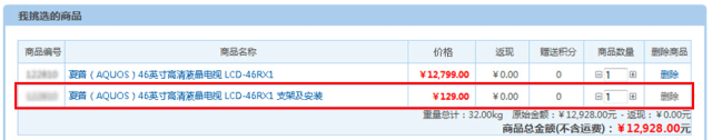 这是这个电子商务网站的购物车,注意红色框内的商品并不是我选购的,所以我很奇怪为什么它会突然出现。于是我清空购物车,再来一次,发现只要我选择这个46英寸的电视,这个“该死的”支架和安装就会出现,而且“删除”功能那一项是灰色inactive的状态,根本不允许你删除。然后我恍然大悟,只要你买这个电视机,就必须同时购买支架(后来我弄明白是壁挂架)和安装。