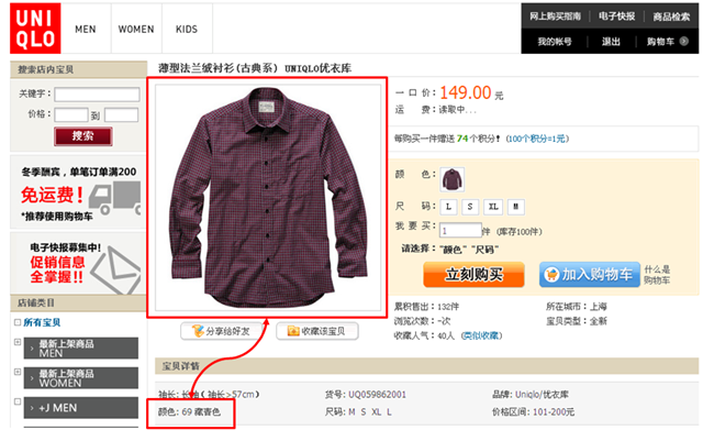 图片中的衬衣是暗红色的,但是文字标注的颜色却是“藏青色”,我很困惑,显然我并不知道我要购买的将是什么颜色。我当然可以通过在线的客服进行咨询,但是这对我来说太麻烦了。所以我放弃了这个购买。