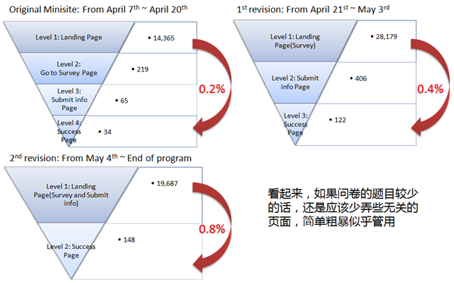 在线调研是另外一种极端转化的例子,因为对于在线调研而言,被调研人每做一个题目,都是朝最终转化前进了一步。但是,我们常常被困扰的是,最终的问卷中有很多多是“未完成”问卷,人们做到一部分就放弃了。