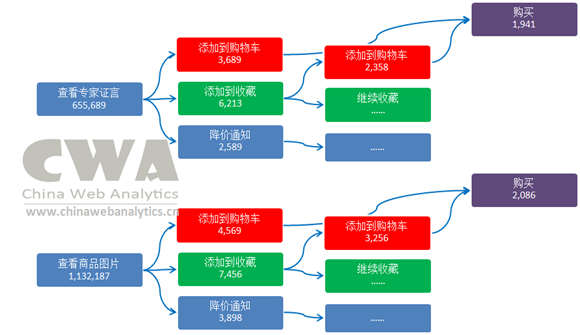 (3)研究绝对转化数量。由于有些预置点的访问量很大,例如图中的查看商品图片,因此最终的访问它的访问者总的转化率比较低。但并不意味着它不是一个关键性的预置点,我们需要用最终它带来的绝对转化数量多少来判断重要性,并且和其他预置点作比较。