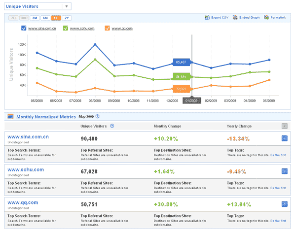 - 除基本流量数据外,也提供诸如月度UV,停留时间之类的更深一层次的网站分析数据。