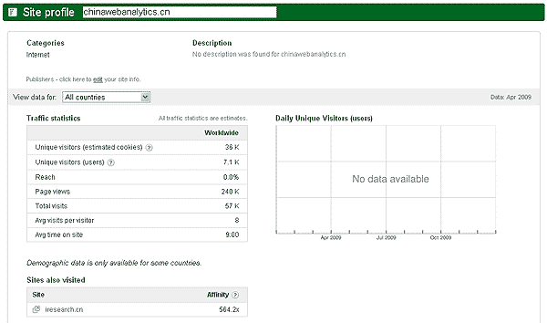 Google Ad Planner是我在研究陌生网站流量上最喜欢的工具,倒不是因为它是为在线广告媒介服务的,而是因为它有直接的数据,而且涵盖了那些已经相当长尾的网站——例如我的这个网站:www.chinawebanalytics.cn。