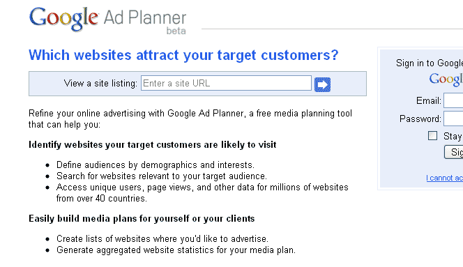 利用Google Ad Planner来研究网站流量的方法非常简单,你完全不需要用它的那些Ad Planning的工具,你需要的只是登出你的Google账号,然后进入它的首页面。如下图所示: