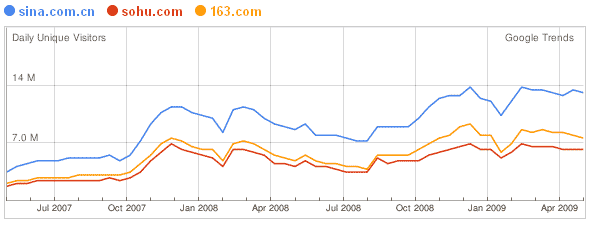 另外,之前还学了一种方法,通过百度指数或者Google Trends看 这个网站的站名被搜索次数的大小和趋势,比如 ”新浪“在百度搜索里面的热度变化。不少网民的习惯是通过搜索引擎作为入口进入相应网站的,如果这种人群占网站来源的比例一定,这个关键字的热度变化一定程度上也可以做参考。