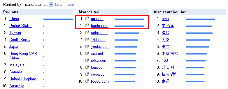 总体而言,这是一个很直观而且很易用的工具,并且有一些数据是其他工具所没有的,例如Also visited和Also serached for这两类数据——毕竟Google在这些数据上占有先天的优势。Google是如何获得流量数据的呢?我认为可能是利用了Google Bar(浏览器上的Google工具条),以及其他一些Google客户端工具,也可能是直接使用了Google Analytics的数据(Google Analytics数据的分享是opt on的)。具体怎么回事,Google官方给出了一些含混的回答。不管怎样,Google本身已经具有的某种垄断特质让我相信他们的数据要比其他类似网站的数据准确得多,在中国也是一样。