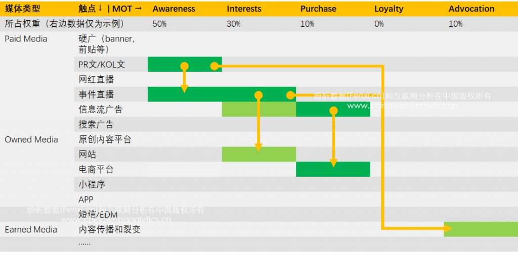 这个图的主旨是对campaign中消费者的旅程(customer journey)进行设计的“索引表”。任何一个campaign都有营销目标,因此上图第一行是AIPLA模型指导下的营销活动的常见的目标,并且第二行为每个单一目标打了权重,每个campaign的权重设置可能都是有区别的,毕竟不同campaign的偏重不同。