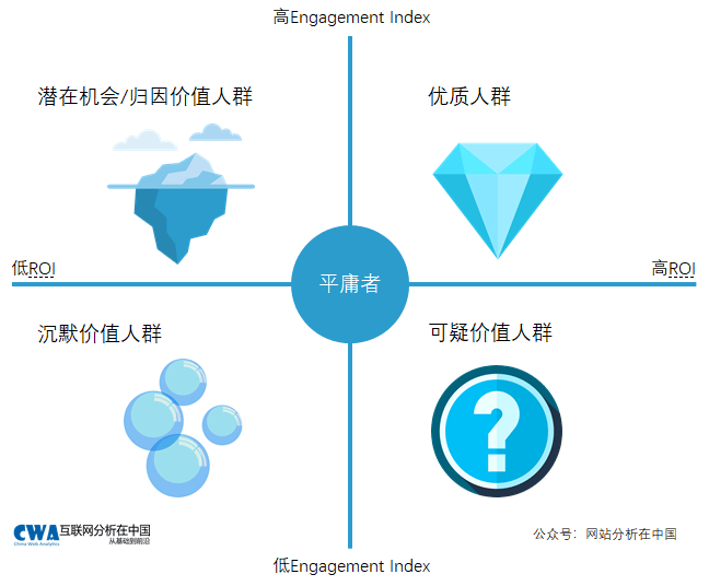 理解Engagement-ROI模型并不困难,它描述了人群的行为(兴趣)和最终变现之间的最直接关系。高兴趣而低变现(上图的第二象限)和低兴趣而高变现(上图的第四象限)都值得我们进一步挖掘。尤其是高兴趣低变现的情况,可能蕴含着未被发掘的价值或潜在机会。