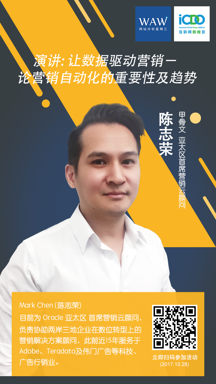 Mark是Oracle亚太区首席营销云顾问,负责协助两岸三地企业在数位转型上的营销解决方案顾问,此前近15年服务于 Adobe、Teradata及伟门广告等科技、广告行销业。