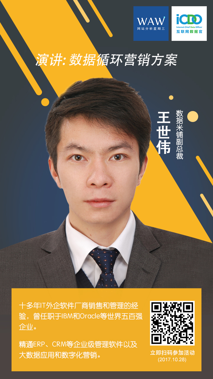 王世伟先生所在的公司是目前淘内最大的数据和CRM服务商之一,他的业务也已经扩展到淘外,王世伟先生拥有十多年IT外企软件厂商销售和管理的经验,曾任职于IBM和Oracle等世界五百强企业。精通ERP、CRM等企业级管理软件以及大数据应用和数字化营销。