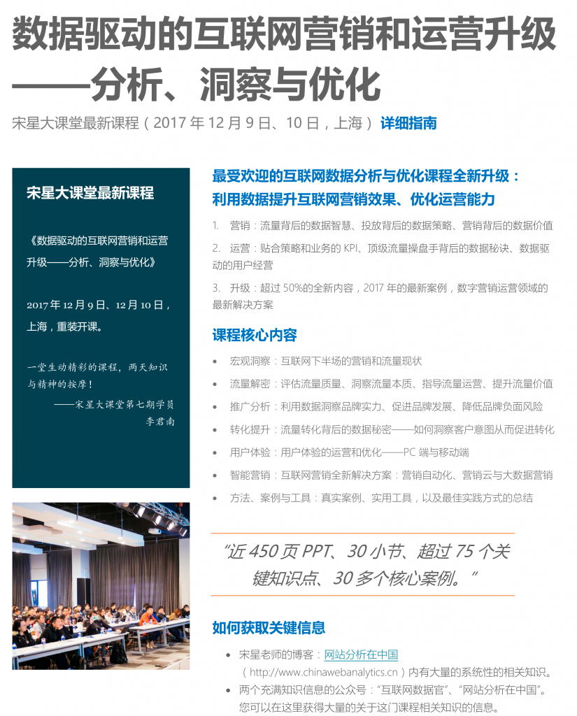 点击链接了解更多详情:【最后15席】宋星大课堂全新升级课程:数据驱动的互联网营销和运营——分析、洞察与优化