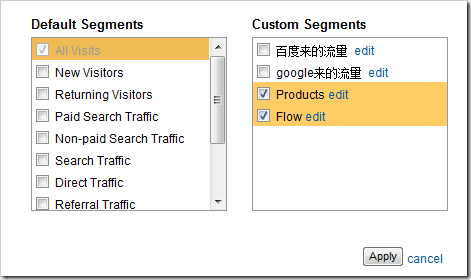 从使用上来说,感觉这个Advanced Segments就是预设好的Advanced Filter。如果不用Advanced Segments,我需要在Advanced Filter中用关键字一步一步地过滤出自己想要的数据;而用它的话,只要点选就能得到自己想要的数据。不知道我这个理解对不对?