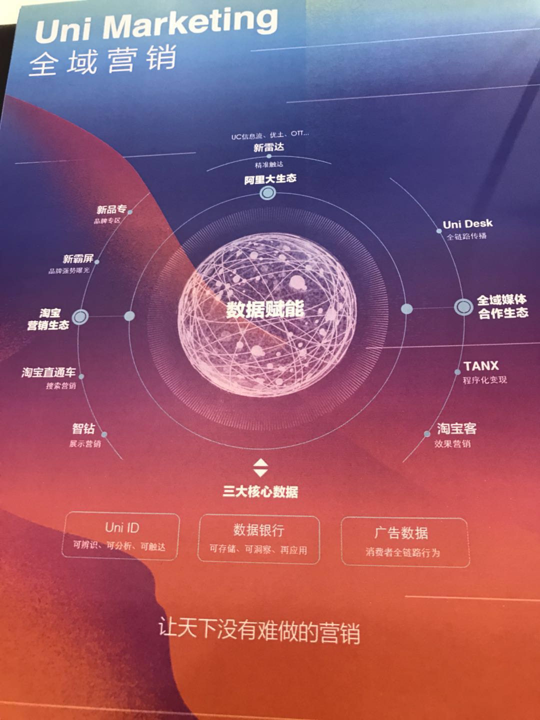 所以,难免有另外一个事情被这个事情稍微淹没,这个事情倒是我更应该关心的——Uni-Marketing。就是下面这个在阿里云栖大会上被偷拍的有点变形的图。