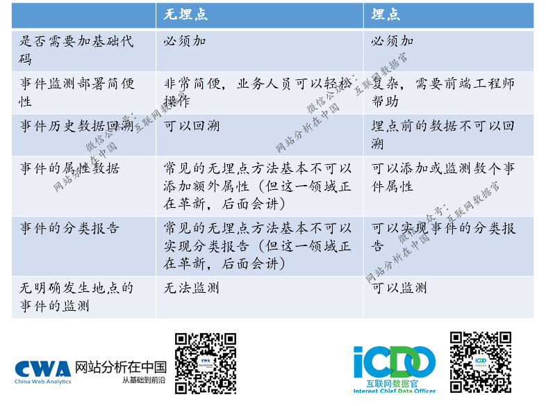 所以,我们可以做一个表比较埋点和无埋点方法的优劣势。