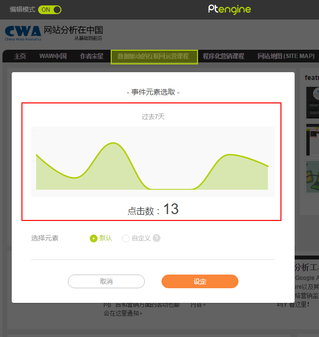 从这个界面(Ptengine的可视化事件监测界面)可以看到,我并未对“数据驱动的互联网运营课程”有任何事先的设定,只是点击它之后,该交互链接的历史点击数据就直接呈现在我的面前了。