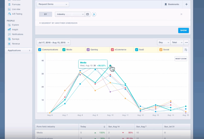 例如,mixpanel对下拉菜单这样的交互行为中,菜单的所有属性进行自动记录,以帮助实现更好的数据获取和分类。在mixpanel中,“无埋点”被称为“autotrack”,即自动监测。在下图中,如果你要监测一个下拉菜单“What industry are you in?”中具体每个选项的点击次数,mixpanel可以自动帮你实现。