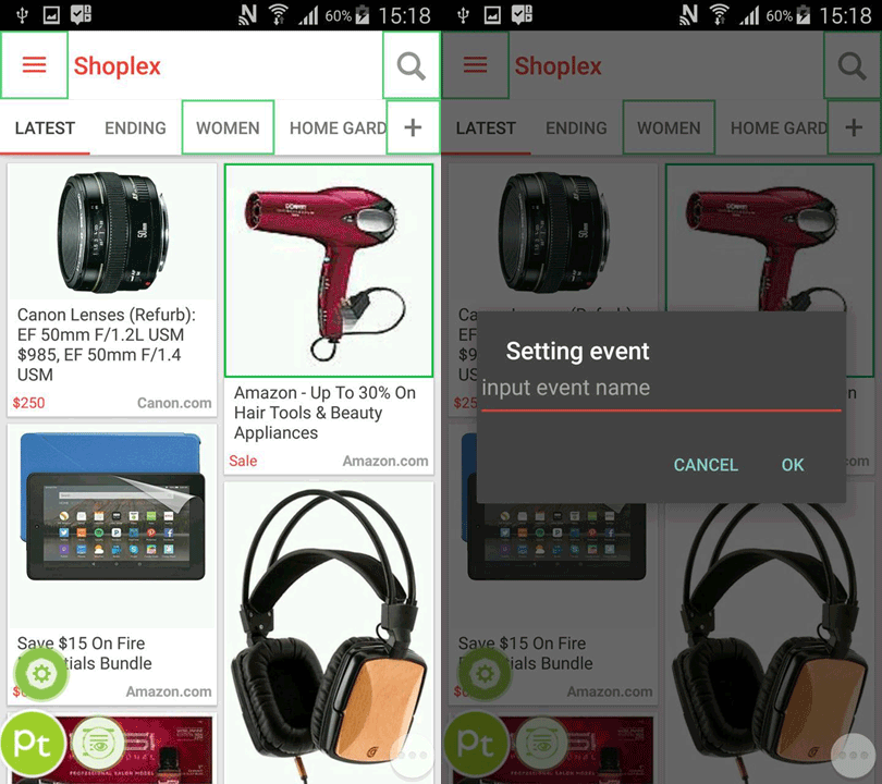 一旦想出了好点子,技术的实现就不会是问题。大家的解决方法都大同小异——首先部署监测工具的基础代码,然后在监测工具的后台开启“无埋点部署选项”,当你开启这个选项之后,你再进入你要监测的页面或者app的时候,你的鼠标(或者手指)点击操作,就变成了为监测工具指定监测点的操作。你用鼠标(或者手指)点击某一个用户交互的位置,一个监测工具安排的弹窗会打开,在这个弹窗中你可以为这个监测点命名,然后工具就开始为你记录这个位置的用户互动数据了。并且人们发现,这个方法不仅仅可以用在对event(事件)监测上,对普通的http的交互,同样适用。例如下面的图示: