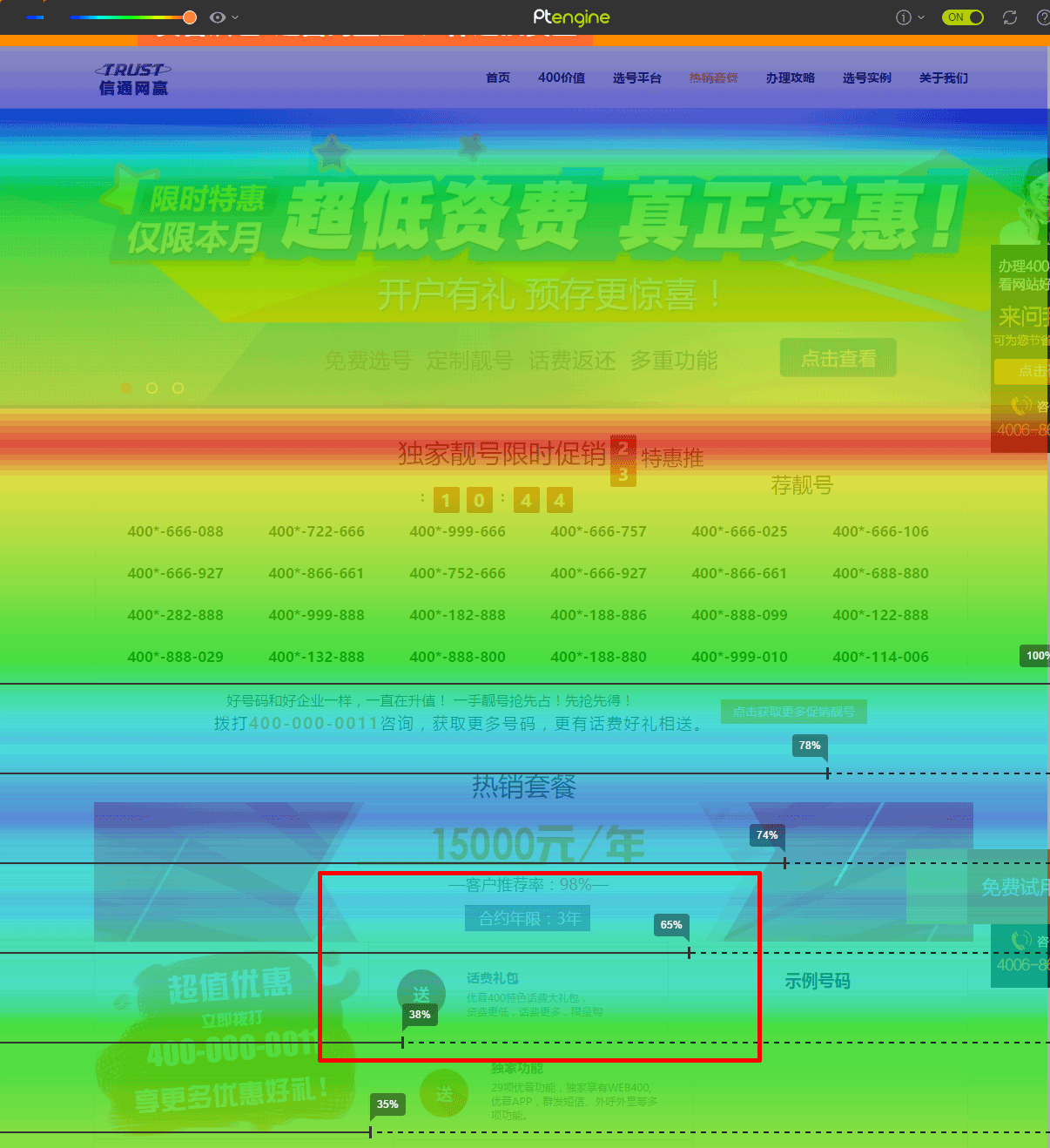 从用户的阅读线图(在以前的文章:运营优化的秘密武器:重新认识热图的力量!(上)有详细解释什么是阅读线图,简单讲,上图中红框内的65%意思是有65%的用户滚动页面,浏览到了页面的这个位置。而红框下部的38%,则表明只有38%的人浏览到了页面的这一位置)可以看到当人们看到了“15000元/年”的页面广告之后,大部分人都丧失了继续浏览页面的兴(yong)趣(qi)。如果在这一页发生了大量的离开网站的事件,我们不难理解或许是价格因素让人们望而却步。